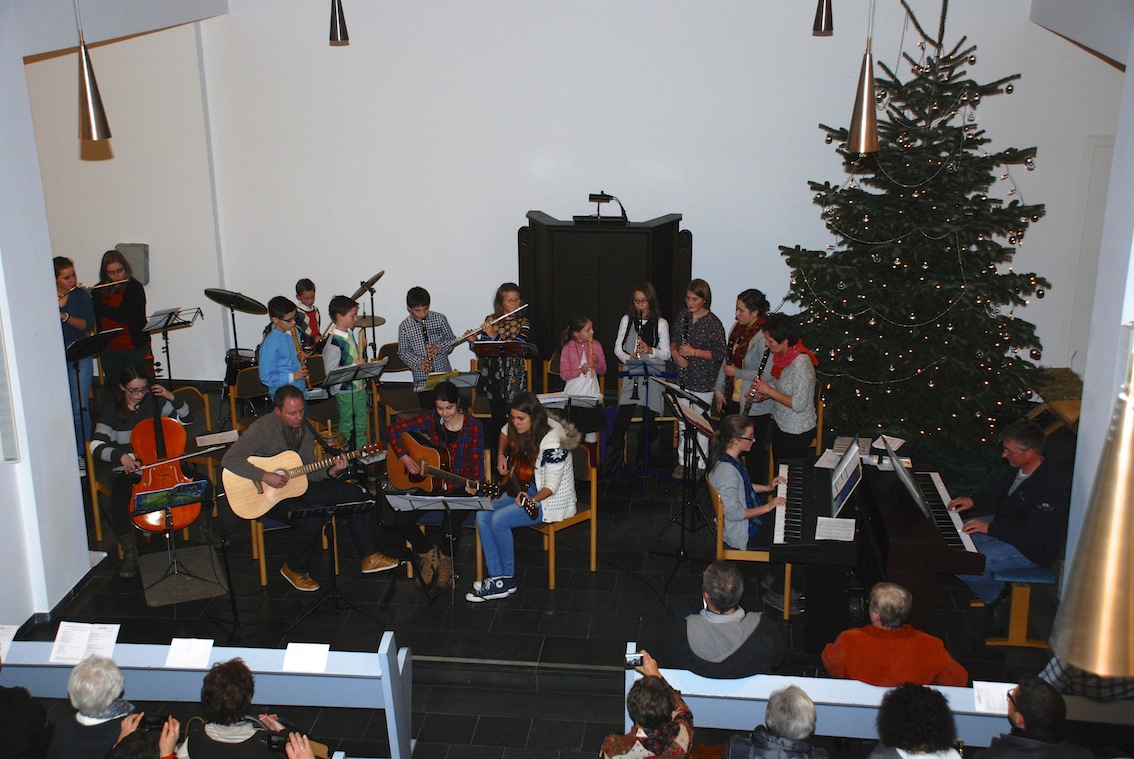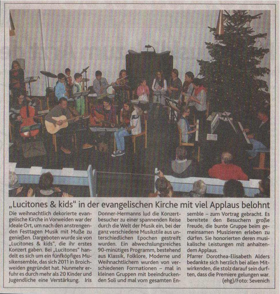 Das wohlige Gefühl der Entspannung, das wir oftmals nach den Weihnachtstagen zwischen den Jahren empfinden, war genau richtig, um das erste Lucitones&kids Konzert in Broichweiden zu erleben. Die evangelische Kirche, weihnachtlich dekoriert, war ein idealer Ort, um nach den anstrengenden Tagen mit Muße Musik gemeinsam zu erfahren. Iris Donner-Hermanns lud die Besucher zu einer spnannenden Reise durch die Welt der Musik ein, bei der ganz verschiedene Musikrichtungen aus unterschiedlichen Epochen gestreift werden sollten. Ein abwechslungsreiches, eineinhalbstündiges Programm aus Klassik, Folklore, Moderne und Weihnachtlichem wurde in den verschiedensten Kombinationen von Kindern, Jugendlichen und den Lucitones vorgetragen - mal in ganz kleinen Gruppen mit beeindruckenden Solostücken, mal im gesamten Ensemble. Es war einfach eine große Freude, die bunte Gruppe beim gemeinsamen Musizieren zu erleben. Das Publikum reagierte mit begeistertem Applaus. Pfarrerin Dorothea-Elisabeth Alders bedankte sich sehr herzlich bei allen Mitwirkenden, deren Aufregung nun nachließ und die erleichtert waren, dass die Premiere so toll gelungen war.