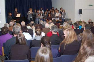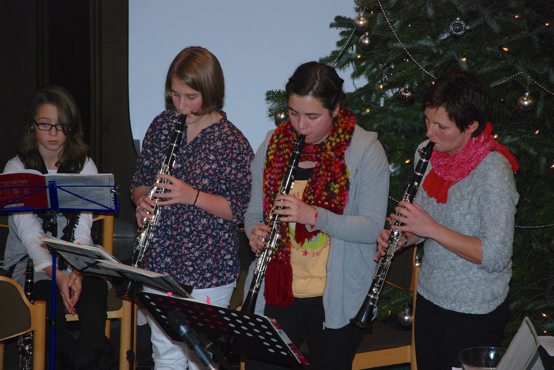 Der Chor LUCIVERS gestaltete unter der Leitung von Klaus Dederichs den ersten Block mit vier adventlichen, zumeist mehrstimmigen Chorstücken. Highlight war vielleicht das bekannte "Adeste fideles", das vom Chor vierstimmig ohne Begleitung vorgetragen wurde. Vor dem zweiten LUCIVERS Chorblock, bei dem insbesondere das ergreifende "Child in a Manger" hervorstach, spielten Lucitones, nun ergänzt durch Katrin Grafen (Klarinette) und Bernd Bresseler (Gitarre) ein weiteres jiddisches Klezmer Stück, den "Elephanten Nigun". Die Instrumentalstücke, "Ursulas Freilach" sowie "Lisa und Laura", zeigten mit schnellen Rhythmen und Improvisationsteilen die große Bandbreite der jüdischen Musik, bei der ganz unterschiedliche Instrumente harmonisch kombiniert werden können.