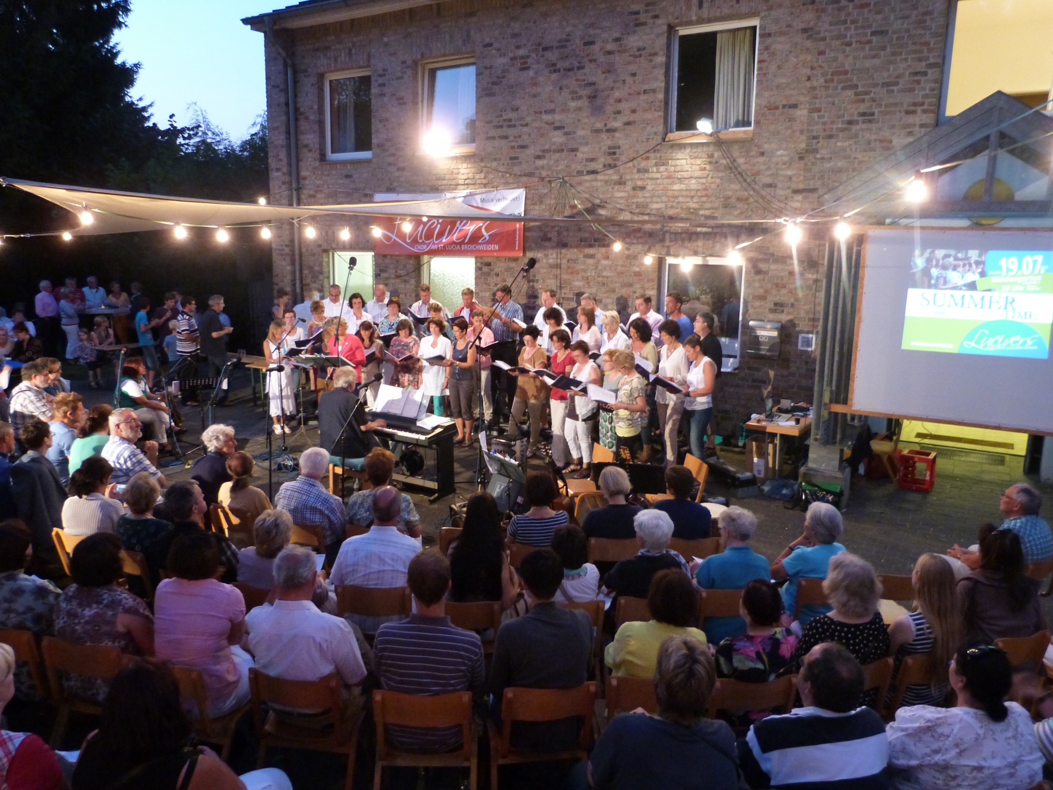 Zur Eröffnung des Weidener Sommers gab Lucivers mit tatkräftiger Unterstützung von Lucitones sein schon traditionelles Summertime – Konzert. Bei herrlichem Sommerwetter ließen sich die zahlreichen Gäste bei Musik und Imbiss von der ganz besonderen Atmosphäre bezaubern. Die musikalischen Darbietungen boten einen Streifzug durch die letzen 5 Jahre Chorprogramm, sowie Tango, Klezmer und moderne Filmmusiken von Lucitones. Mit einem eigens umgetexteten Lied verabschiedete der Chor sich von ihrem Chorleiter Klaus Dederichs, der den Chor von Anfang an begleitet hat. Den Abschluss des rundum gelungener Abends im Weidener Sommergarten bildete der beliebte Mitsingteil bei dem Chor und Gäste gemeinsam bekannte Melodien sangen.