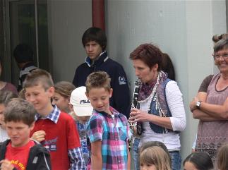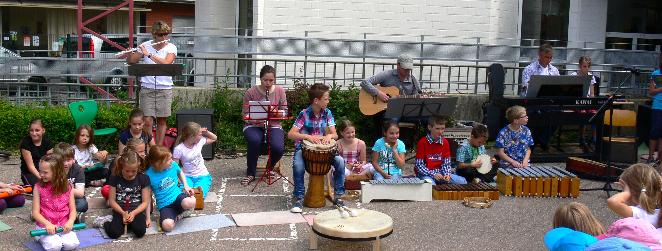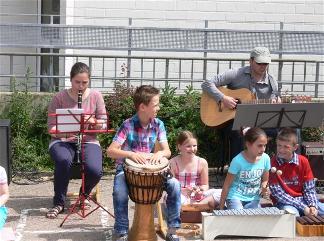 Die Lucitones haben sich sehr gefreut, ein Musikprojekt zu unterstützen, das ihr Gruppenmitglied Iris Donner-Hermanns, Soderschulpädagogin mit Schwerpunkt Musik, an der Hermann-Josef-Grundschule Alsdorf-Hoengen seit Monaten mit ihren Schülern durchführt. Die Kinder lernen über das Medium Musik eine andere Kommunikationsform kennen. Mit verschiedensten Musikinstrumenten lernen die Kinder am Beispiel der Klezmer-Musik das gemeinsame rhytmische Zusammenspiel, aber auch durch individuelle Improvisation, Ihre Gefühle über die Musik auszudrücken. Die Gruppe Lucitones (Iris Donner-Hermanns, Claudia Pütz, Werner Wienands, Katrin Grafen, Bernd Bresseler) trat gemeinsam mit den Schülern beim Schulfest auf und bereicherte den Nachmittag auf dem Schulhof in Alsdorf-Hoengen mit ihrer melodischen "Weltmusik". [bb]